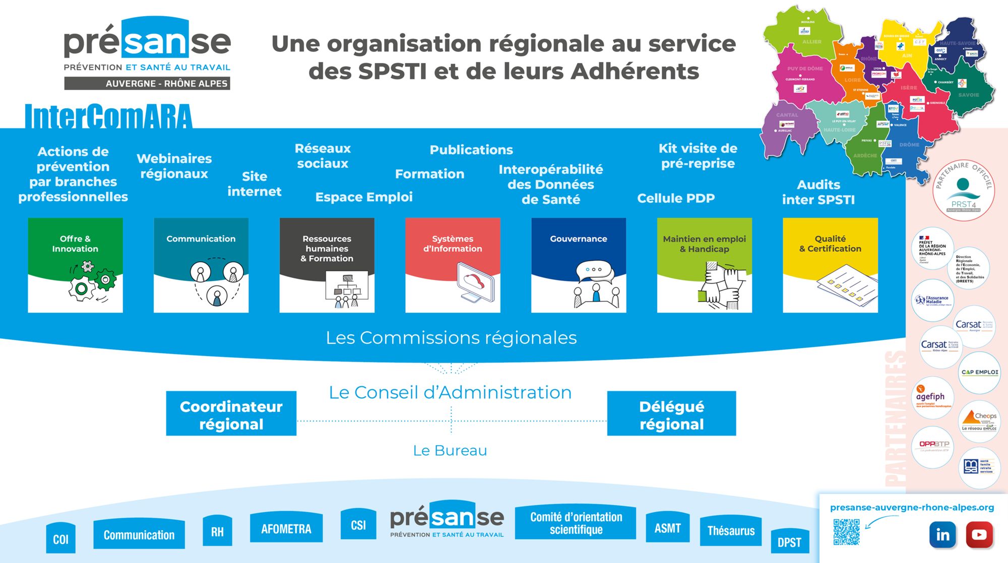 - la Commission Communication, en charge des projets tels que les Rencontres Santé Travail du réseau PRESANSE, le site Internet, la communication auprès des institutionnels, les réseaux sociaux (Twitter, Linkedin, YouTube), Préventica,….