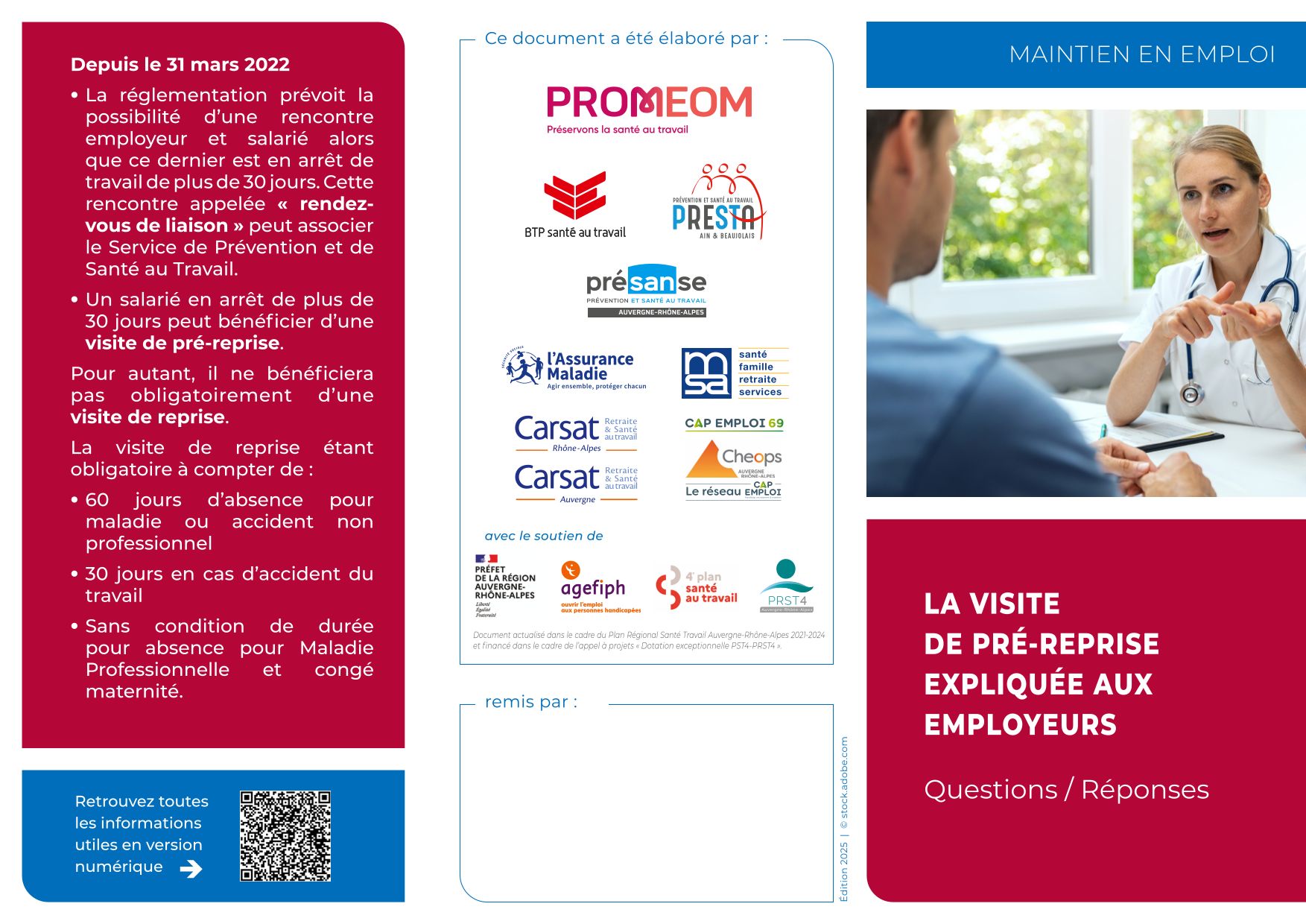 Les différents acteurs de la santé au travail et du maintien dans l’emploi du Rhône ont conçu cette plaquette afin d’informer les employeurs des modalités de la visite de pré-reprise.