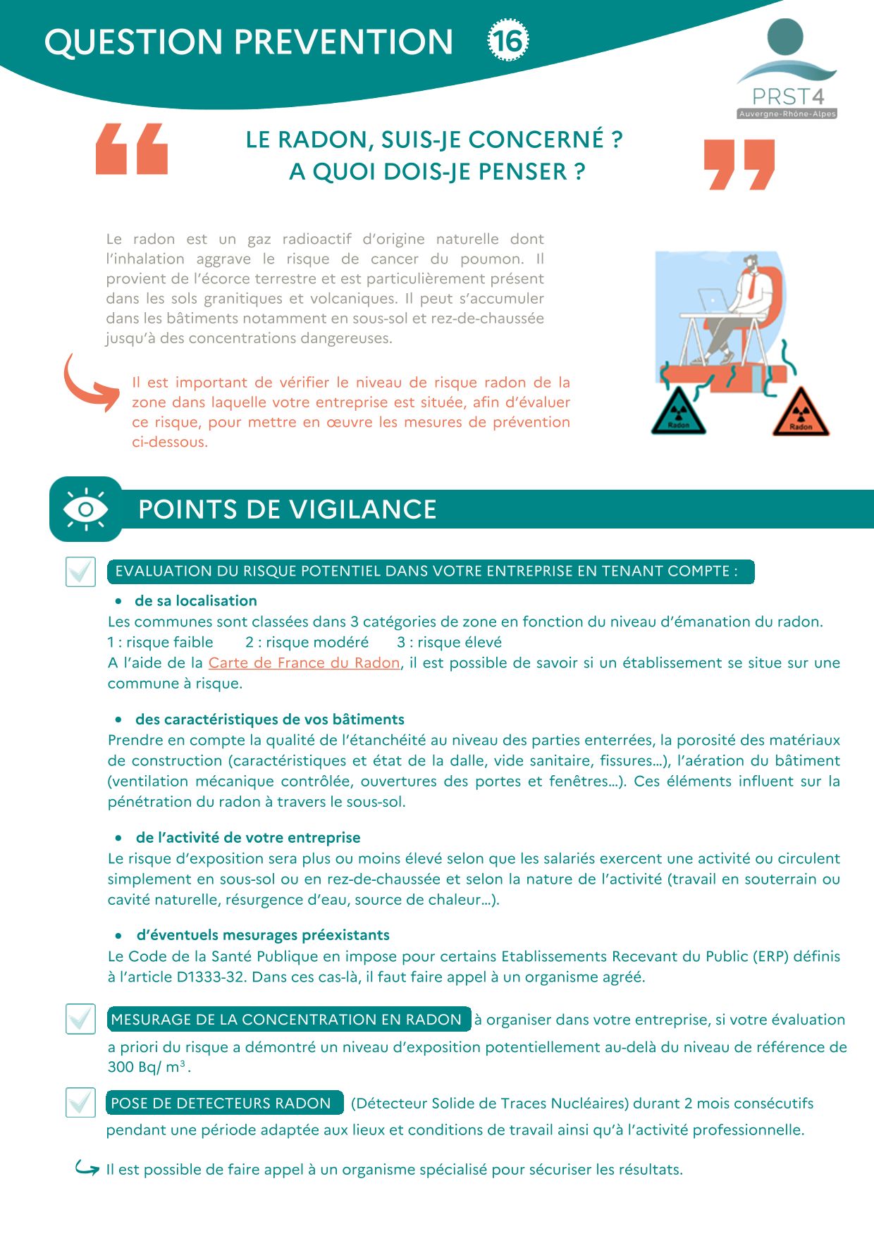 La démarche d‘évaluation de ce risque peut passer par un mesurage à réaliser en période hivernale (pose de détecteurs pendant 2 mois . Toutes les entreprises sont concernées et doivent depuis 2018 d’évaluer le risque radon dans leurs locaux en sous-sol ou rez de chaussée ou si elles exercent certaines activités listées à l’arrêté du 30 juin 2021.