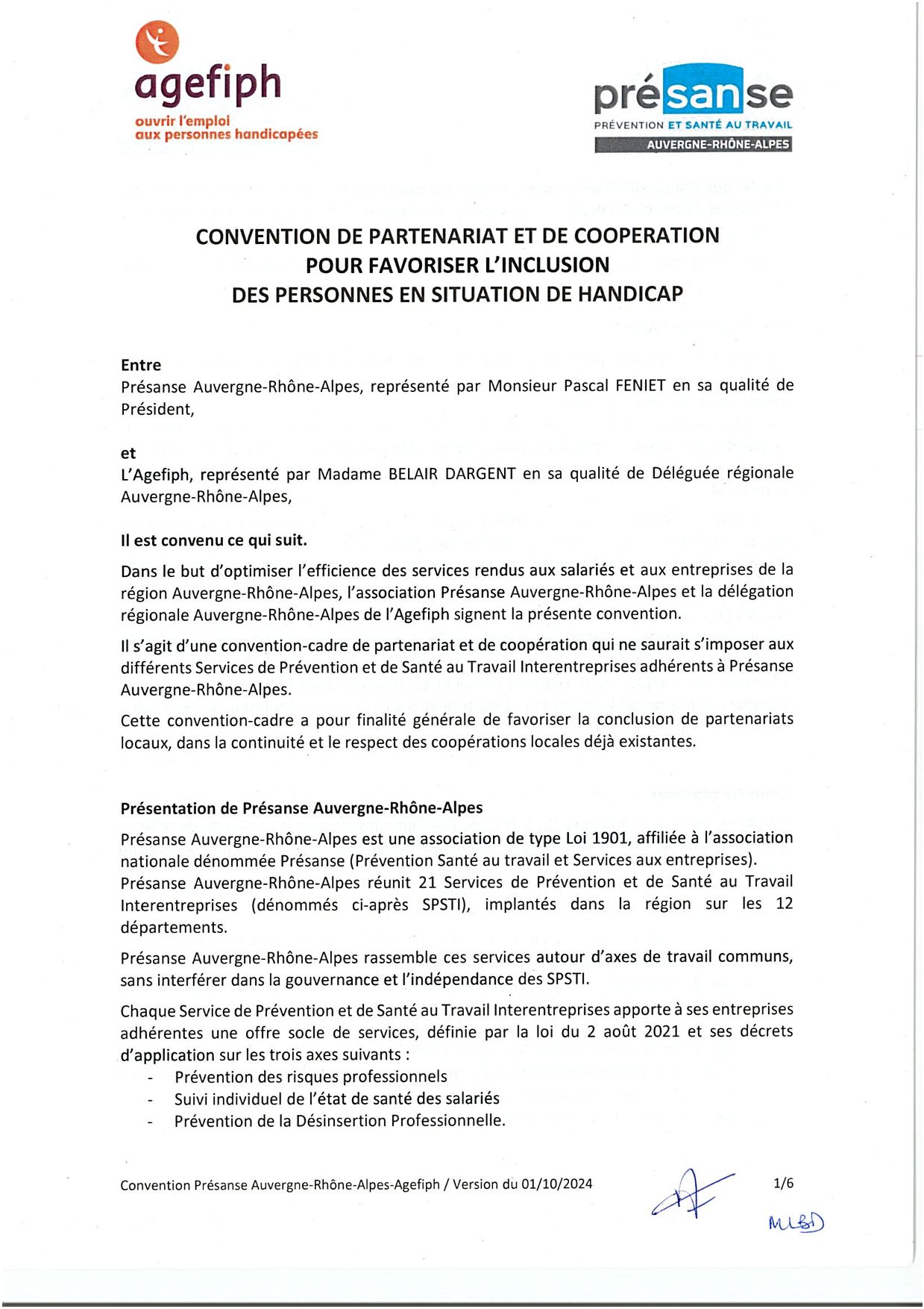 Signature de la convention entre Présanse Auvergne-Rhône-Alpes et l’Agefiph