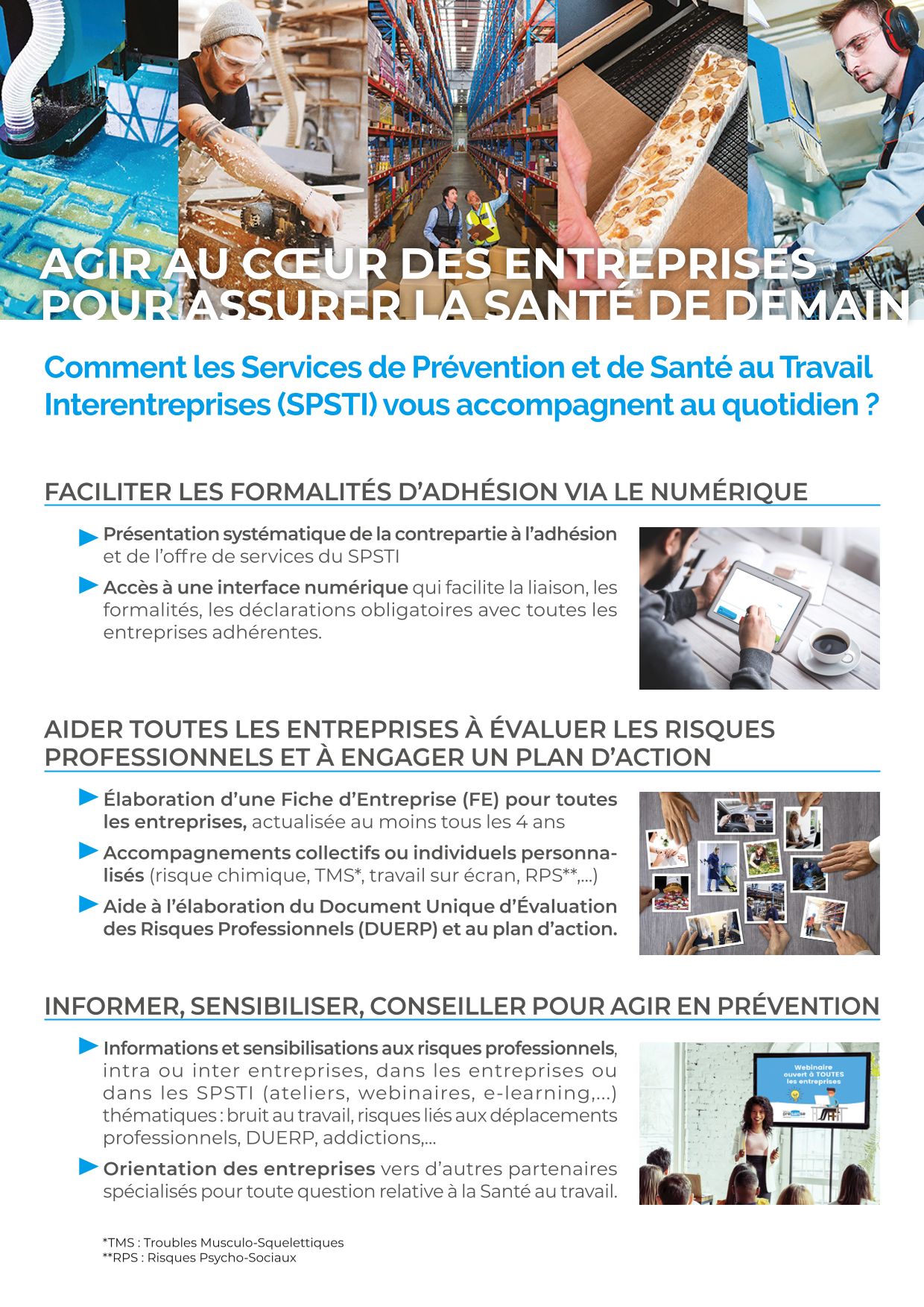L'offre socle de services comprise dans la cotisation annuelle aux SPSTI Retrouvez les ressources mises à disposition pour comprendre. Voici les ressources mises à disposition pour répondre à cette thématique : Comment les Services de Prévention et de Santé au Travail Interentreprises (SPSTI) vous accompagnent au quotidien ? (1.4 Mo) L'ensemble des fiches de l'offre socle dans une brochure (3.0 Mo) Question-Prévention : J'adhère à un SPSTI, à quoi dois-je penser ? (568.6 Ko) Retrouvez les coordonnées de votre Service de Prévention et de Santé au Travail sur notre page dédiée : Le réseau